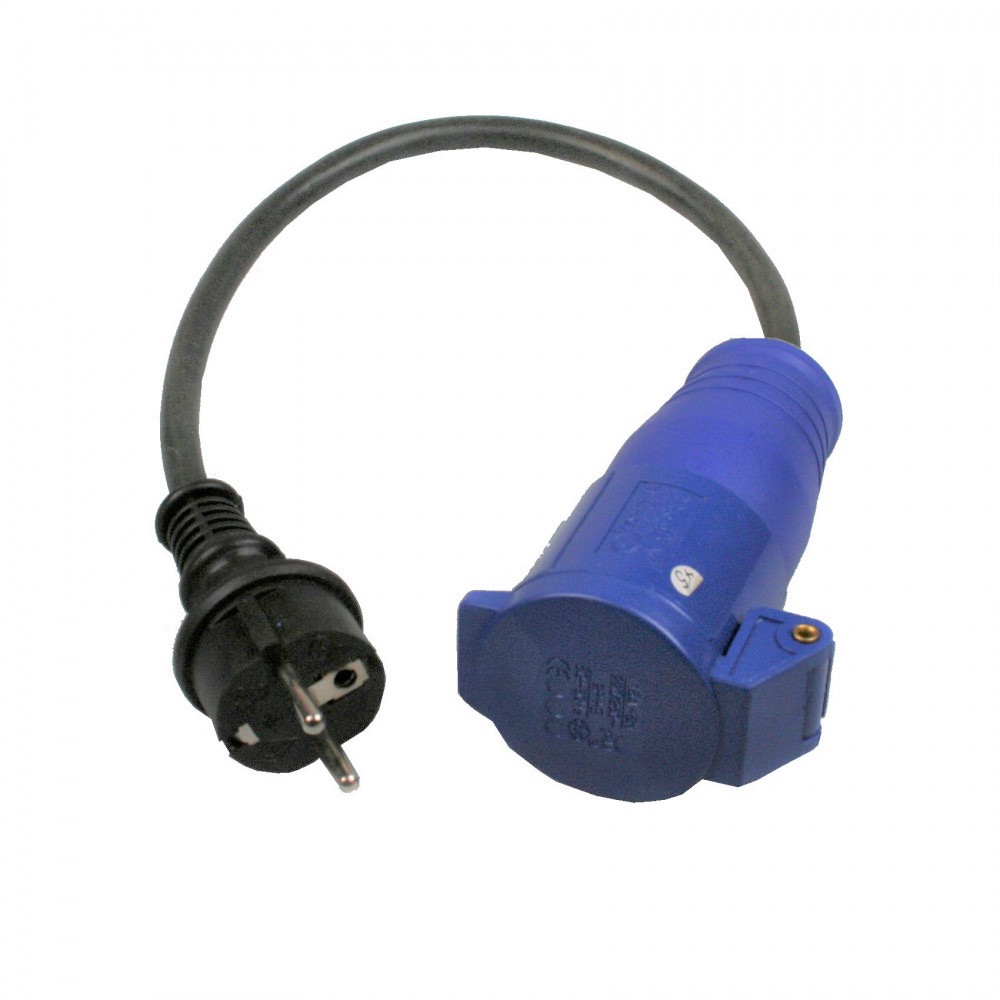Propojovací adaptér do stěnové zástrčky karavanu s CEE zásuvkou, krátkým propojovacím kabelem (cca 20 cm) a zástrčkou Schuko.