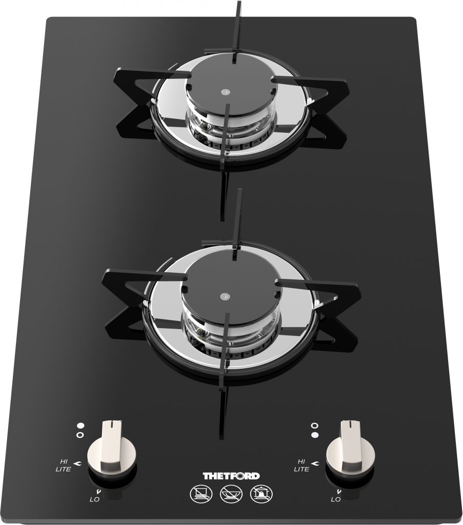 2-plamenná vestavná varná deska (výkon 2 x 1.5 kW) z černého skla s elektrickým zapalováním a pojistkou zapalování. Montážní rozměry: Š 28.5 x H 48.5 x V 9.5 cm, vnější rozměry: Š 30.5 x H 50 x V 9.5 cm, hmotnost: 5 kg.