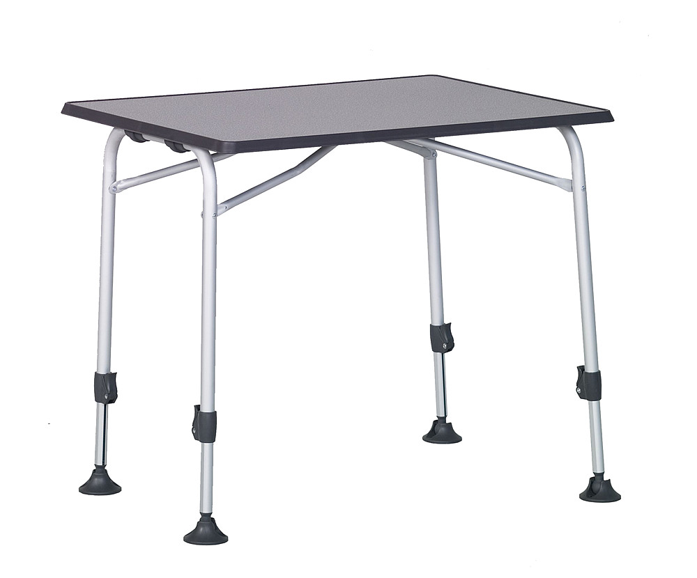 Robustní skládací stůl s hliníkovým rámem a dřevo-kompozitovou deskou. Rozměry 80 x 60 cm, nohy individuálně výškově nastavitelné v rozsahu 55-75 cm. Hmotnost 6 kg, nosnost 30 kg.
