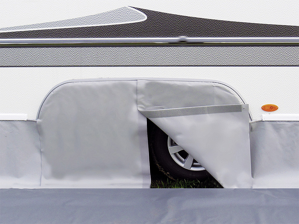 Kryt kola, přesně tvarovaný pro konkrétní typ karavanu. Vyrobený z pevné a pružné netkané fólie s gramáží 430 g/m², odolné nízkým teplotám. Instaluje se nasunutím do připraveného kedrového profilu.