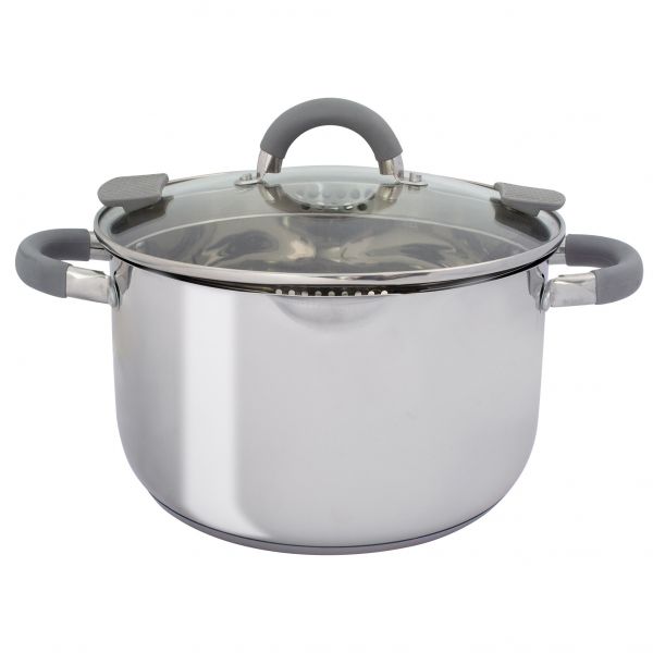 Nerezový varný hrnec se skleněnou poklicí, madla potažena odolným silikonovým povrchem. Silikonové plochy jsou i na poklici pro snadnější držení při nalévání. Vhodný i pro indukční vaření.