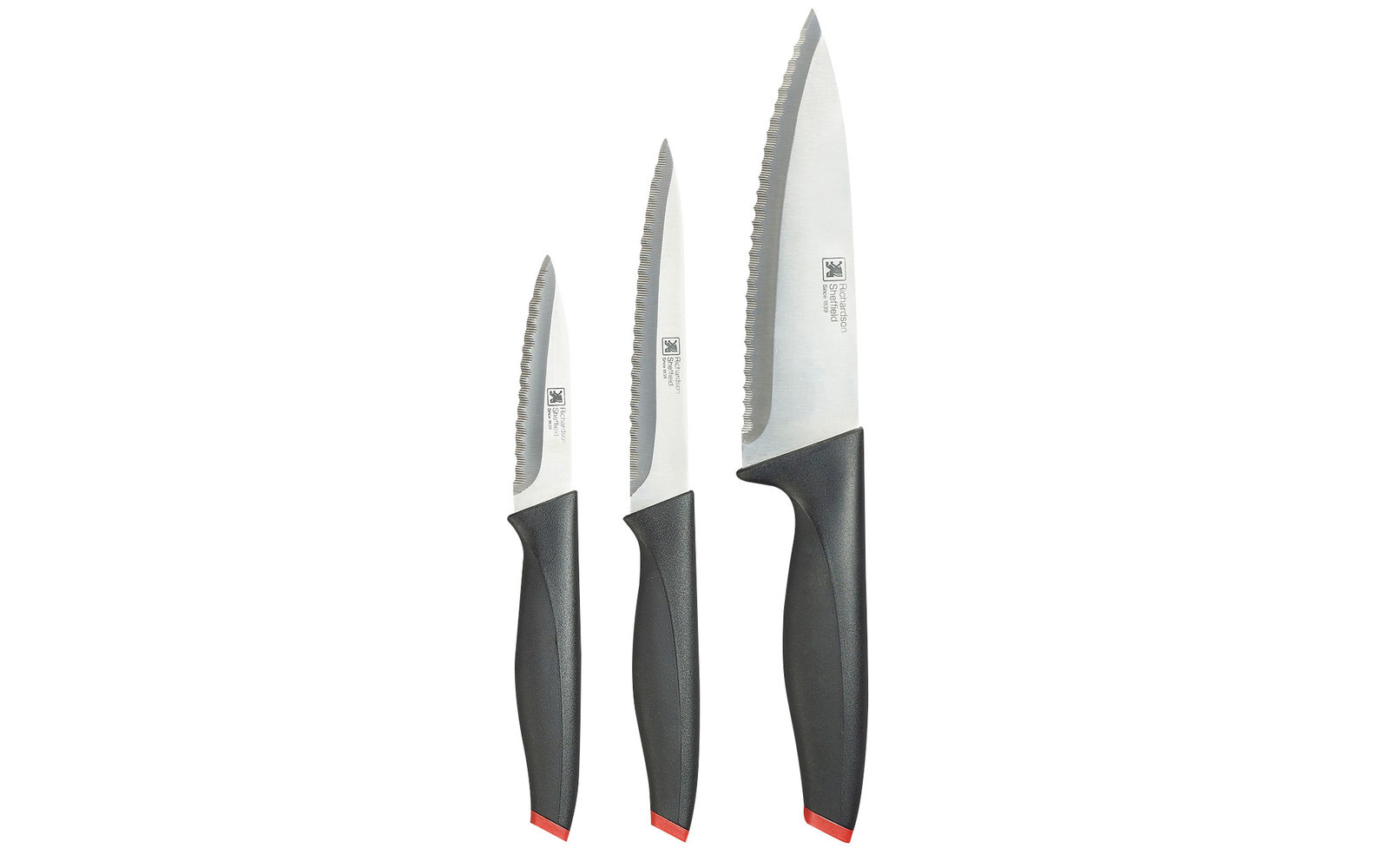 Sada kuchyňských nožů z kvalitní nerezové oceli, v délkách 8,5 cm, 12 cm a 14 cm. Ostří s laserovým mikroozubením, které garantuje trvale přesný řez.