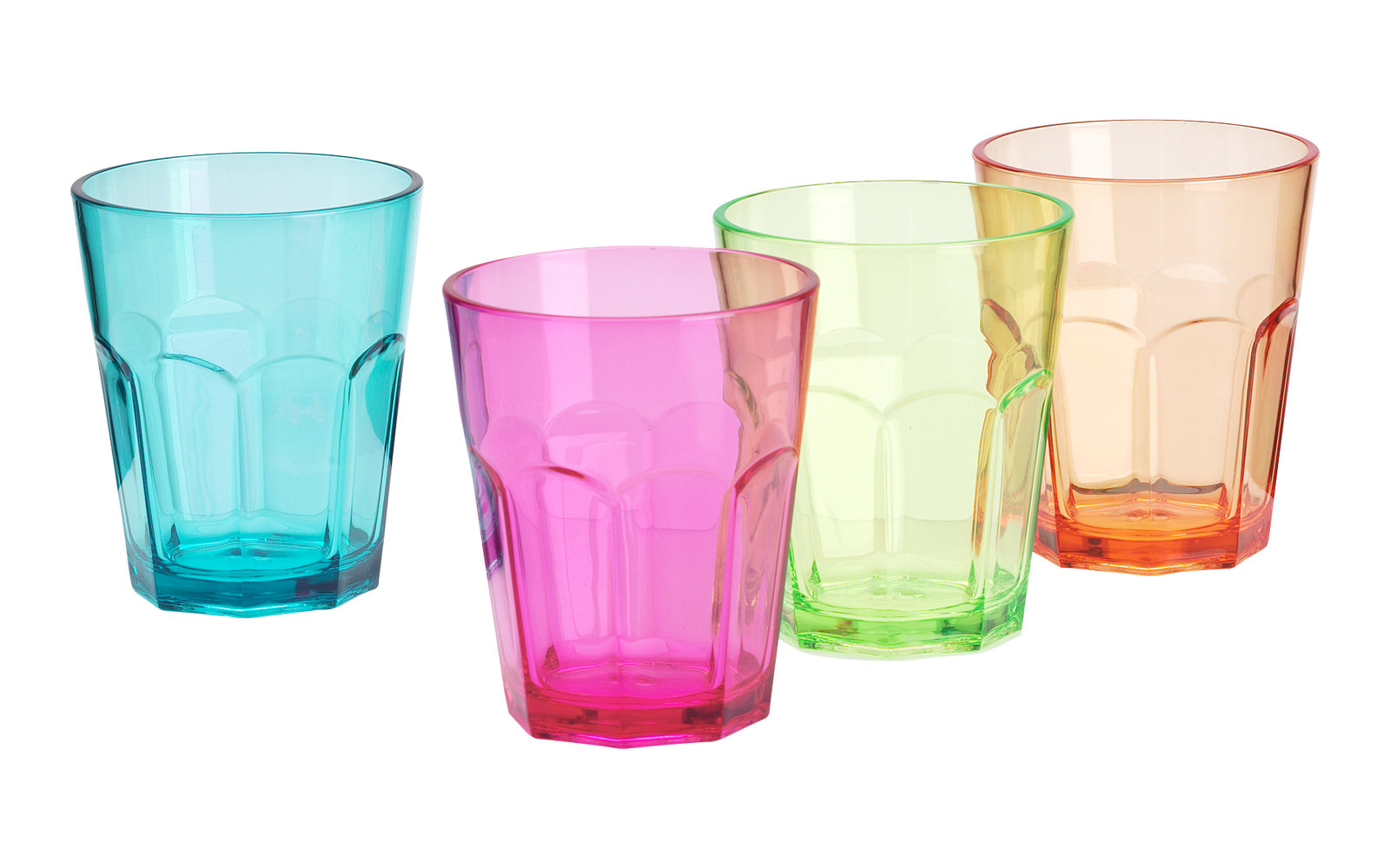 Sada 4 ks velice pěkných a kvalitních různobarevných sklenic od britského výrobce Flamefield Ltd., objem 340 ml, polykarbonát.