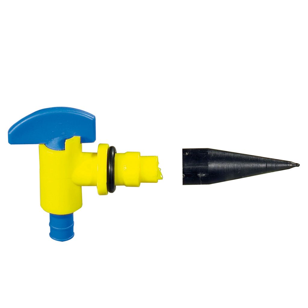 Řešení: Výfukový ventil je jednoduchý na montáž. Stačí umístit instalační hrot na stranu O-kroužku na kohoutu, prorazit stěnu kanystru hrotem tak, aby hrot spadl dovnitř. Nyní je výfukový ventil na místě.