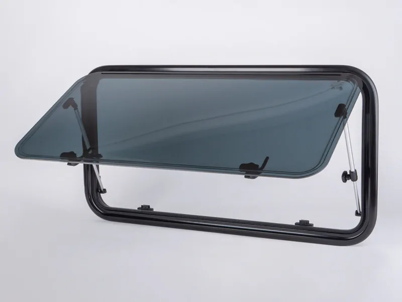 Kvalitní výklopné okno v moderním designu, s dvojitým akrylátovým sklem zapuštěným do hliníkového rámu v elegantní černé barvě. Okno je určené pro rovné stěny, dodává se bez vnitřního rámečku. Instalační svorky se objednávají samostatně, podle velikosti okna a tloušťky stěny. Počet a umístění potřebných svorek je na obrázku produktu.