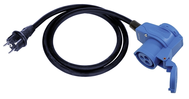 Redukce do stěnové zástrčky CEE s integrovanou zásuvkou Schuko na vnější straně a kontrolkou napětí. Stupeň krytí: IP44, max. napětí 230 V / proud 16 A, kabel 2,5 mm2 o délce 150 cm, hmotnost: 500 g.